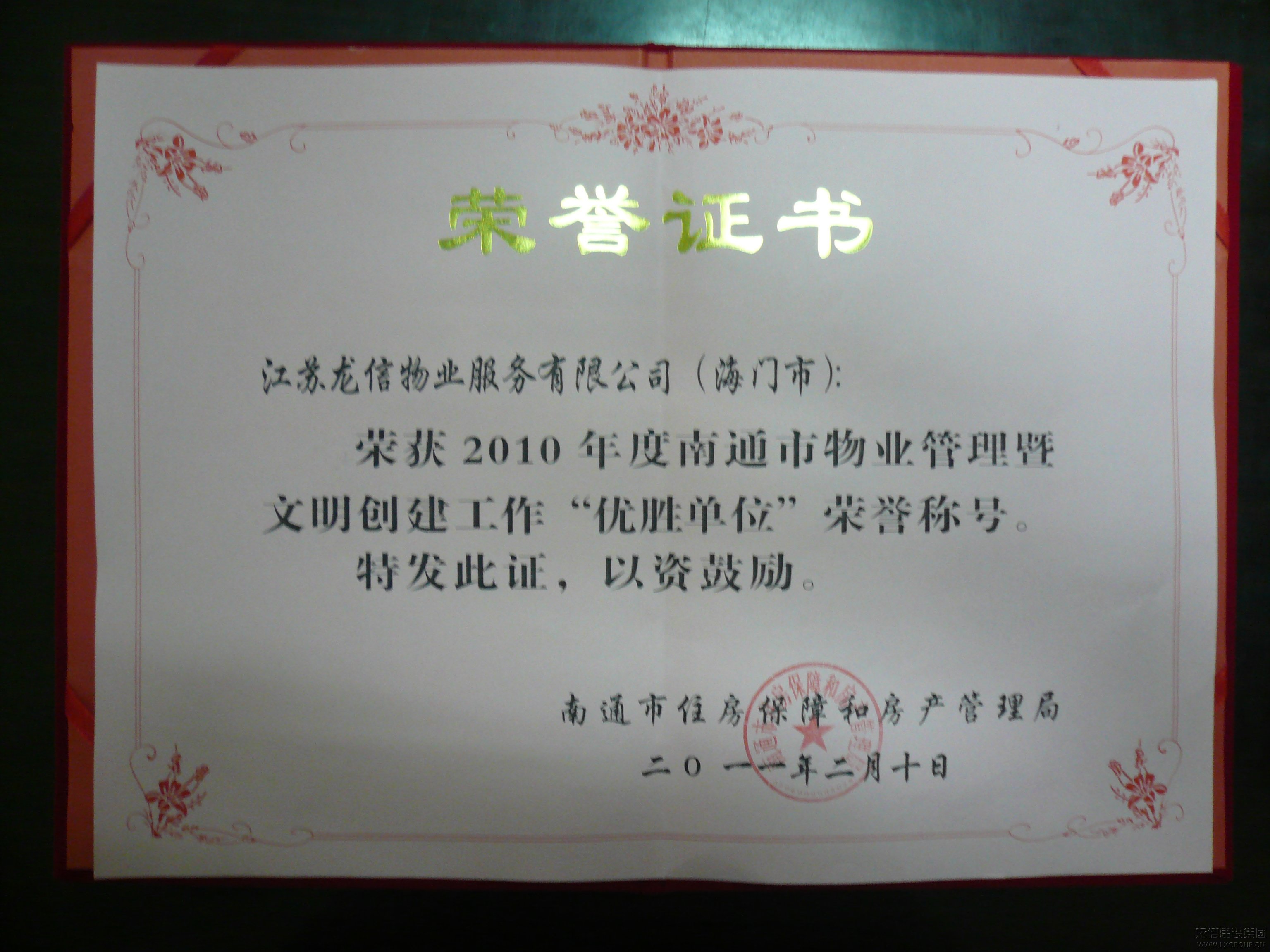 日前,在南通市房管局組織的物業(yè)行業(yè)大會上,江蘇龍信物業(yè)被評為2010年度“南通市物業(yè)管理優(yōu)勝單位”;同時,海門“運(yùn)杰龍馨園”也捧回了2010年度“南通市物業(yè)管理優(yōu)秀小區(qū)”的獎牌。